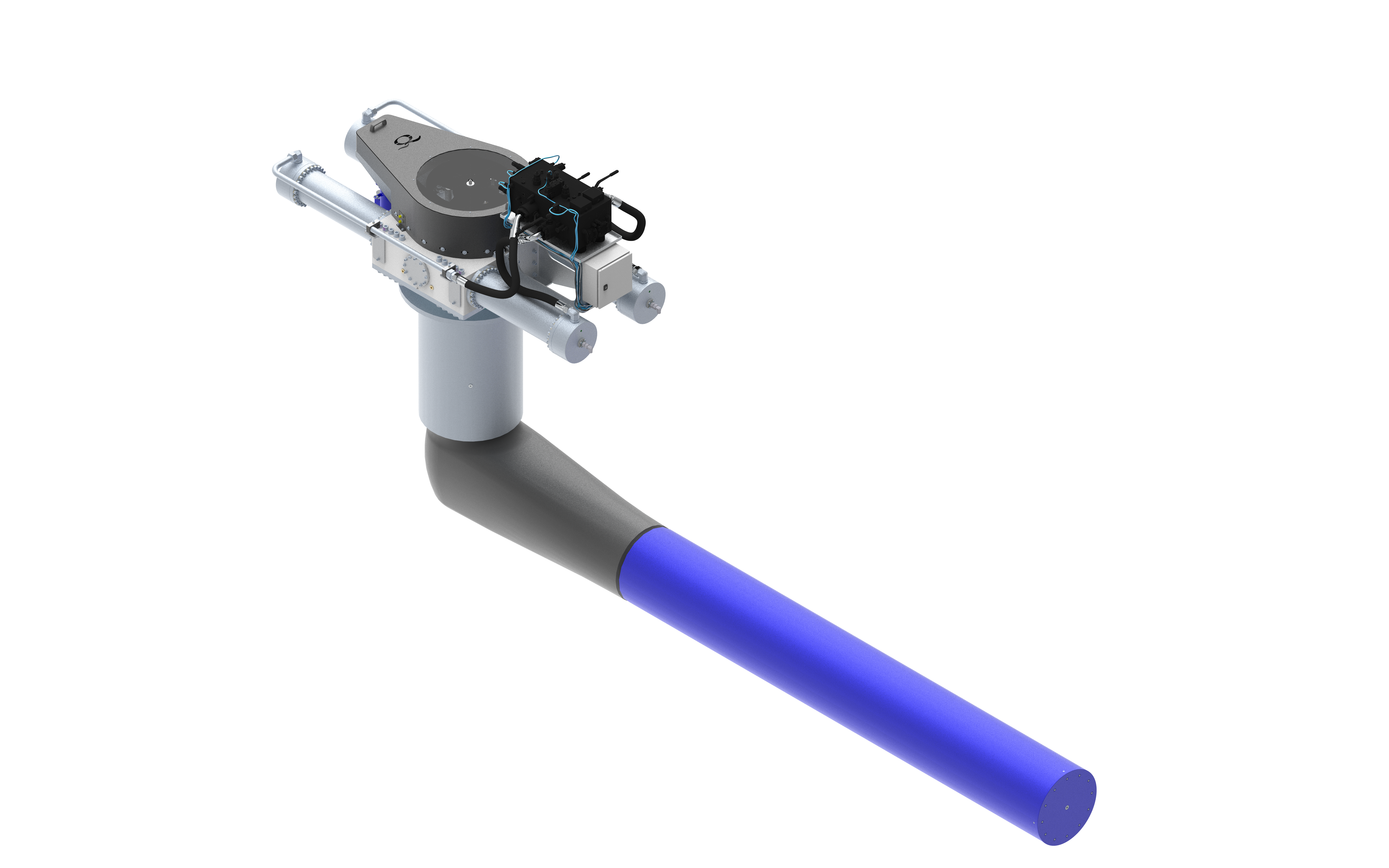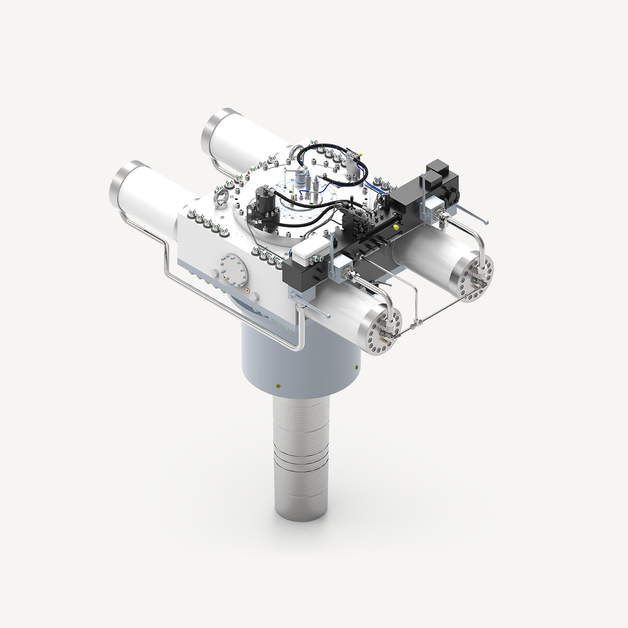 A major component for fin and rotor stabilizer function. The hull unit acts as an intermediary between the control algorithm commands and the hydraulic power system, enabling precise fin or rotor movements for optimal stabilization. The hydraulic cylinders on the top of the hull unit rotate the main shaft, which deflects the fin or rotor to move exactly as directed by the control system.