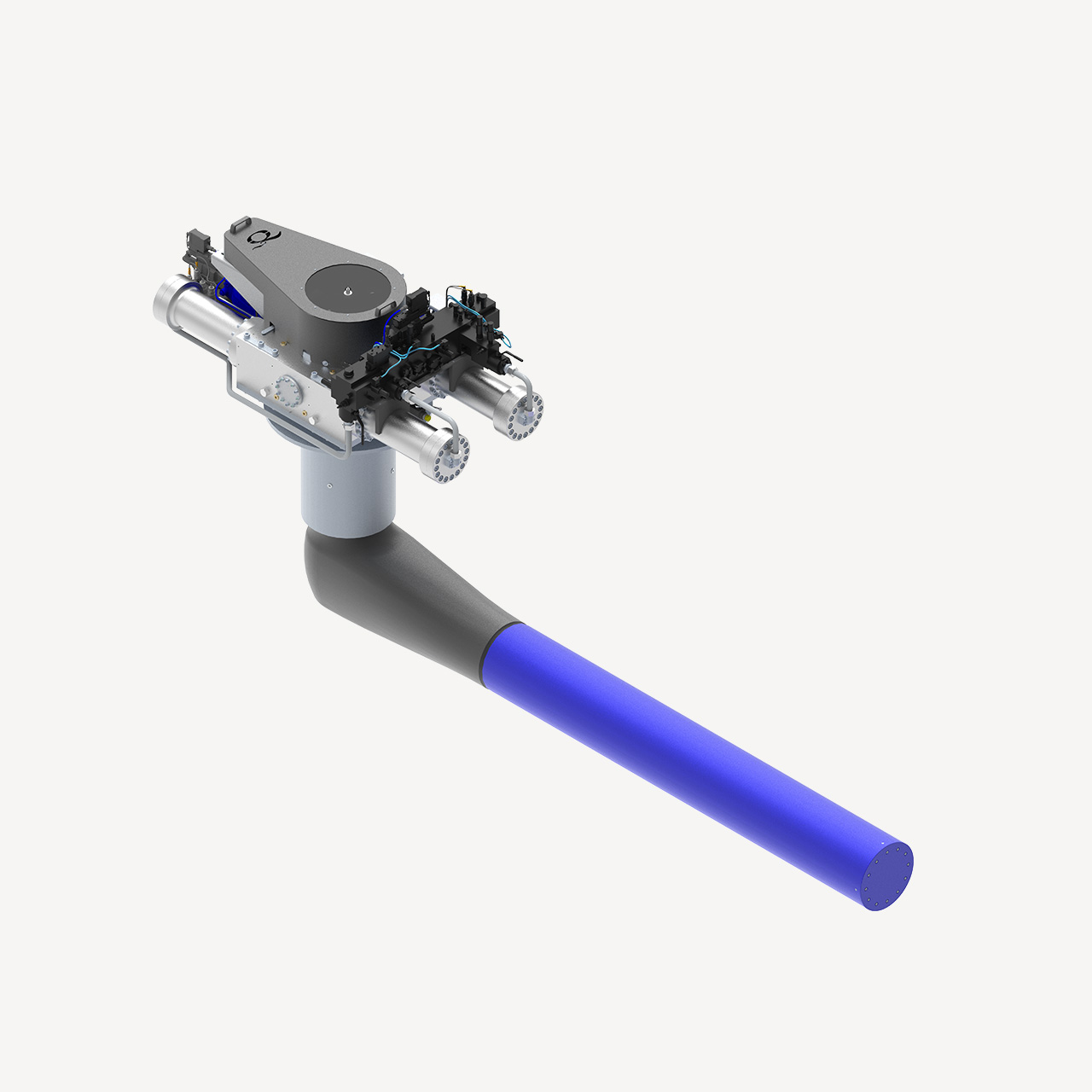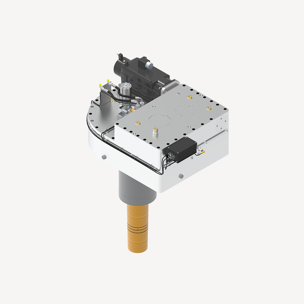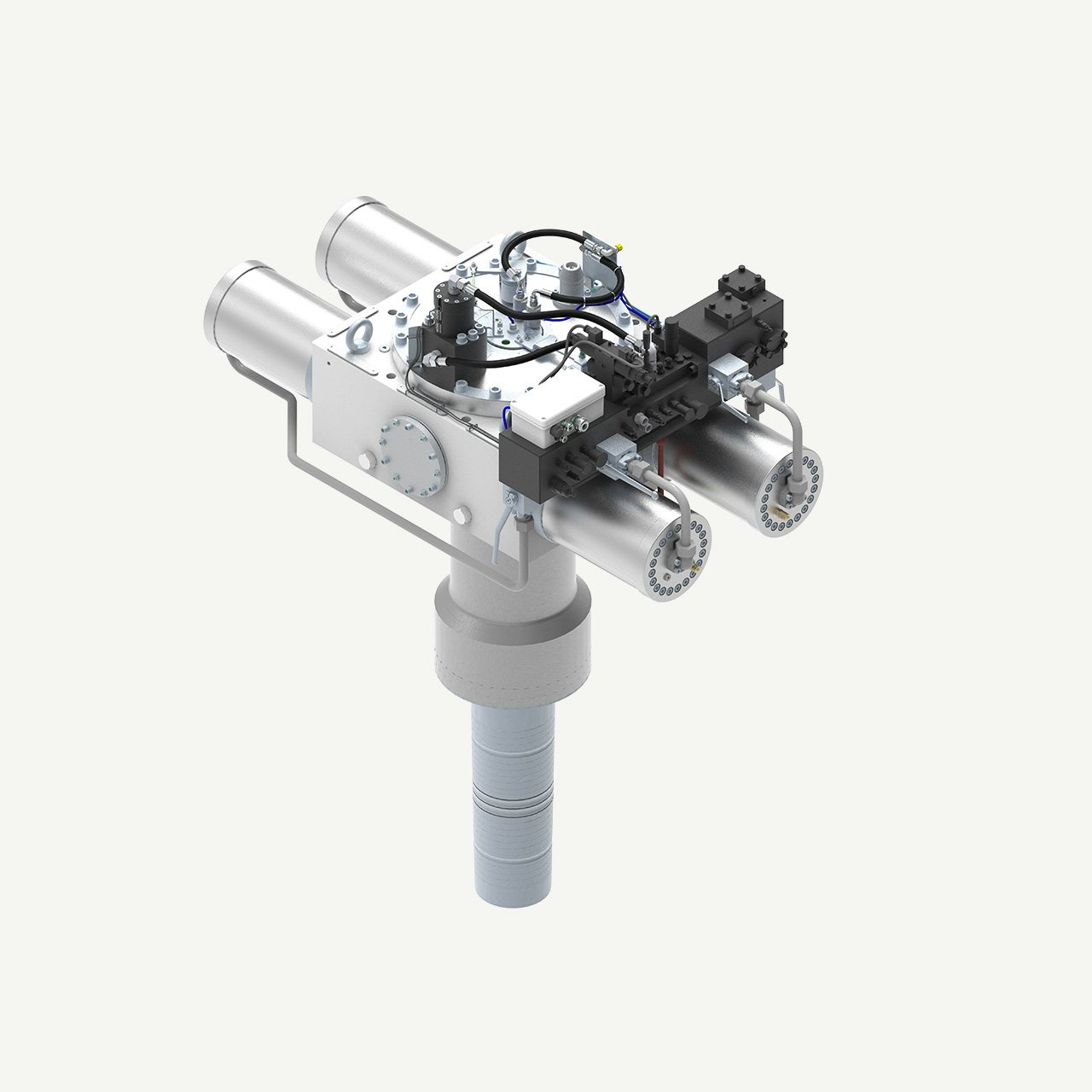 The hull unit acts as an intermediary between the control algorithm commands and the hydraulic power system, enabling precise fin or rotor movements for optimal stabilization. The hydraulic cylinders on the top of the hull unit rotate the main shaft, which deflects the fin or rotor to move exactly as directed by the control system.
